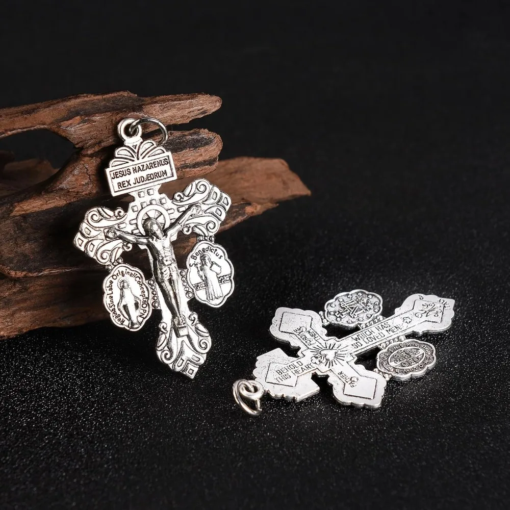 Meaningful Symbolism: The Pardon Crucifix Rosary Parts for Rosaries Catholic holds great significance in the Catholic faith. The crucifix symbolizes the sacrifice of Jesus Christ, while the St Benedict Medal represents protection against evil, and the Medal is a reminder of the Blessed Virgin Mary's intercession.