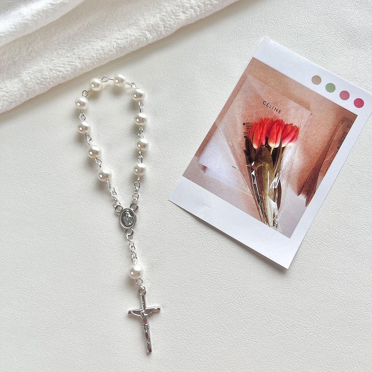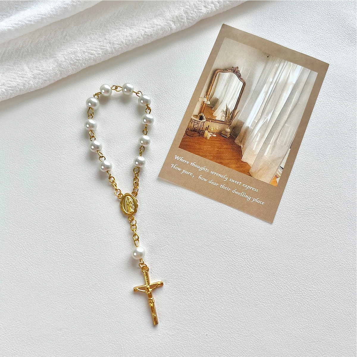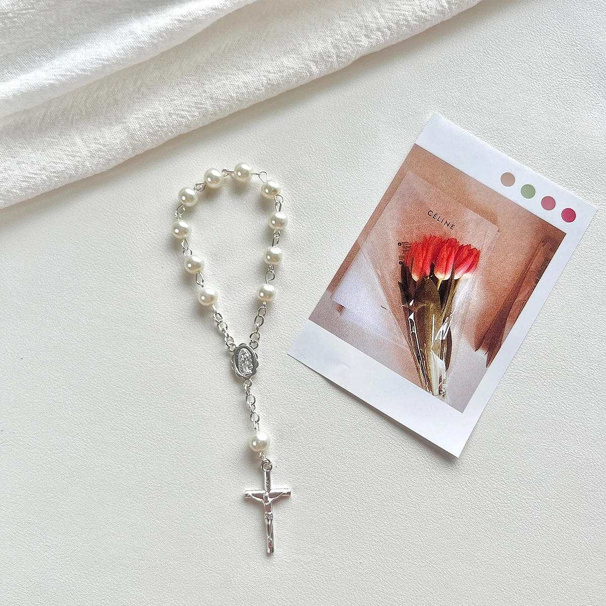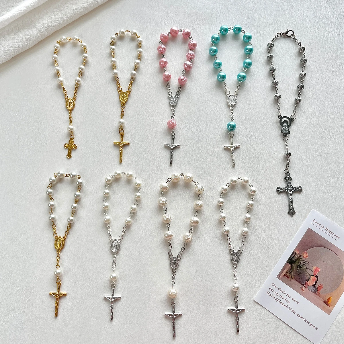 1Pcs Baby 6/8mm Glass Pearl Rosary Bracelet Eucharist Gift Cross Finger Chain Religion Mini Rosary Bracelet Pray