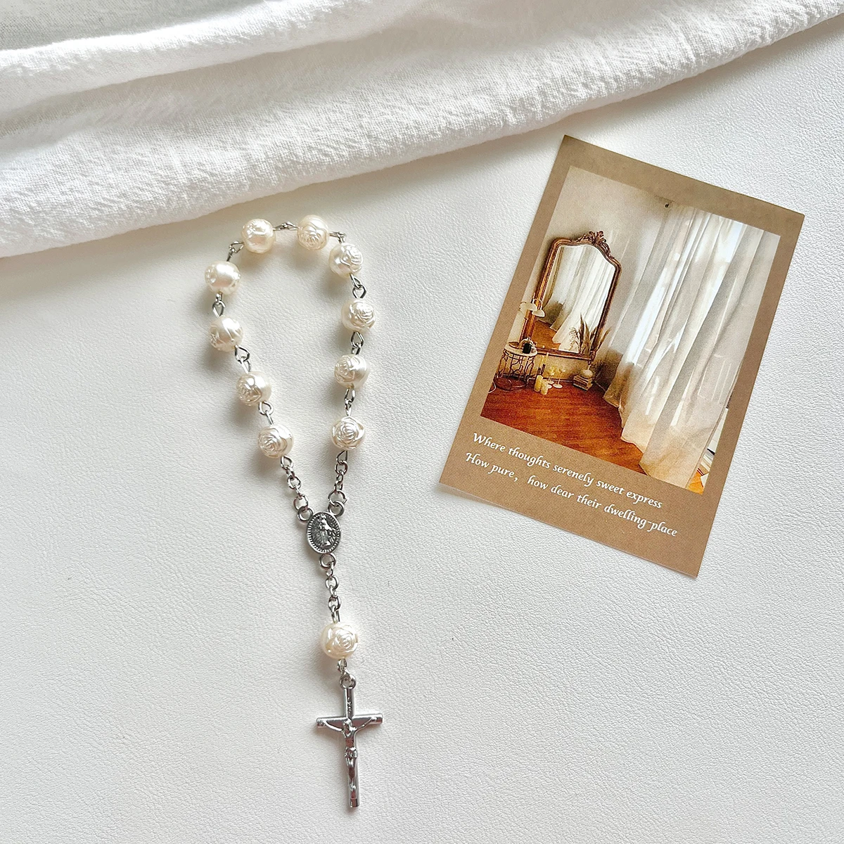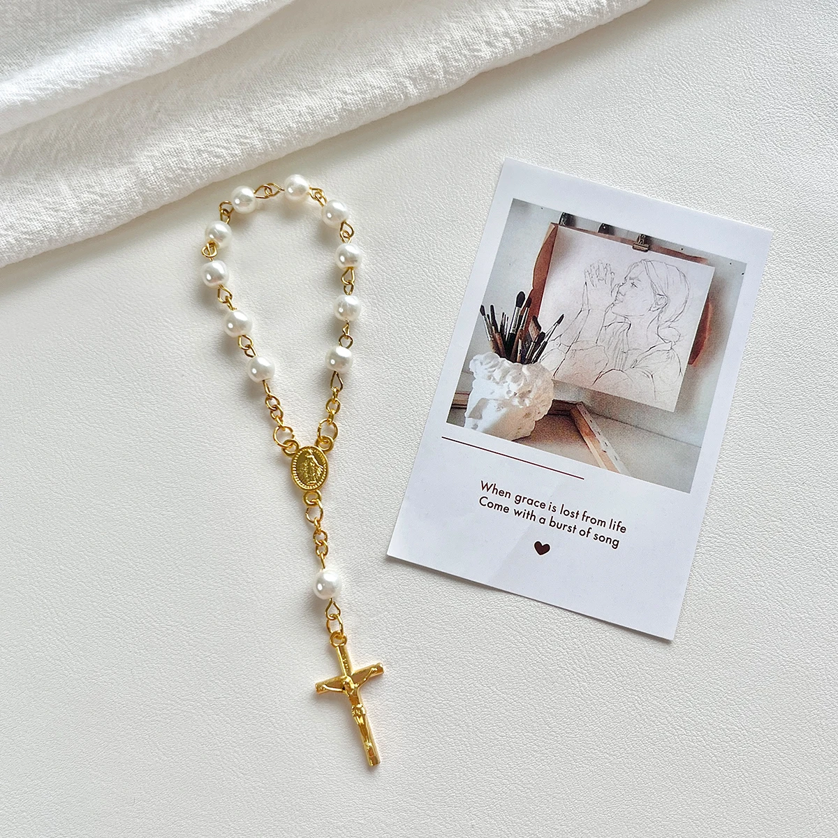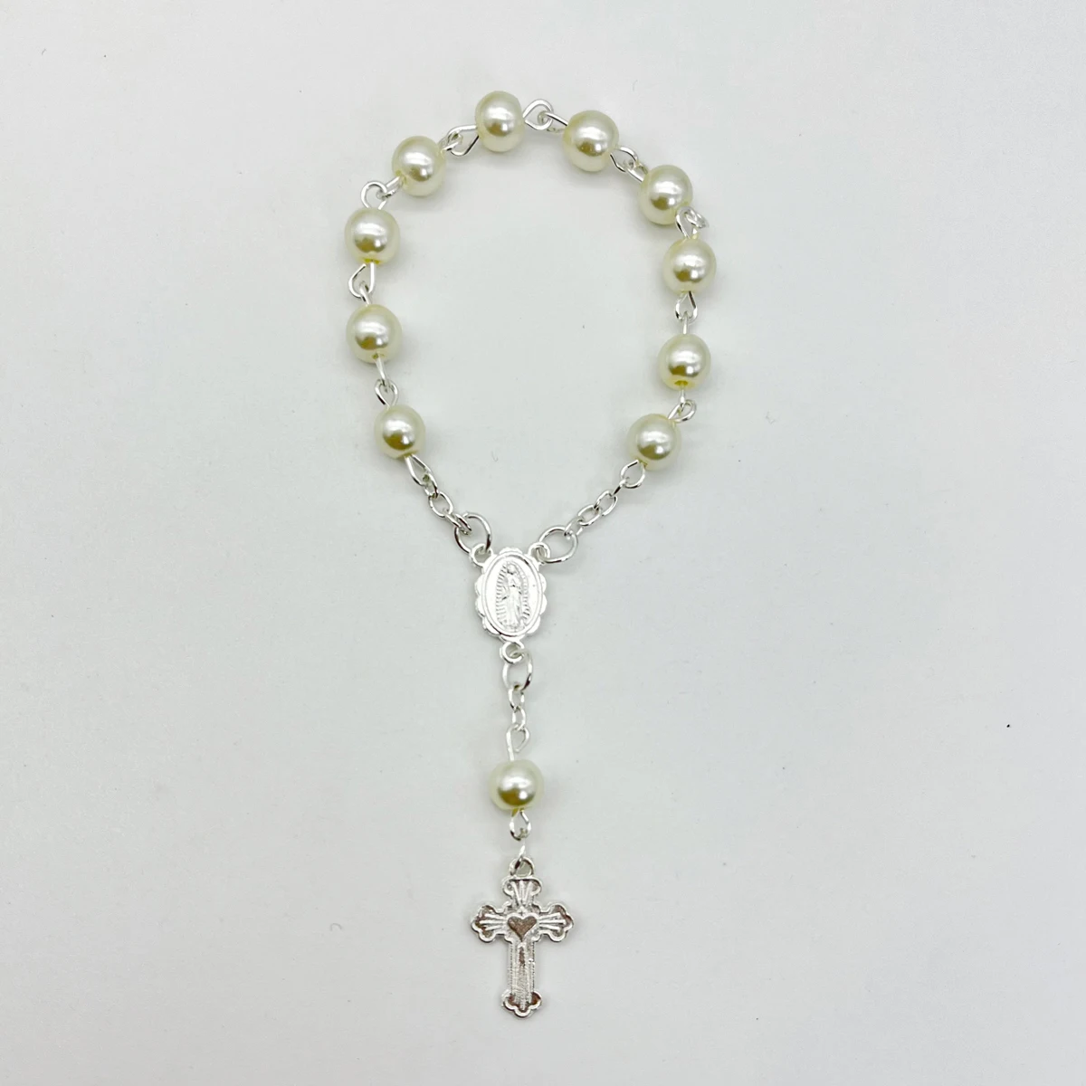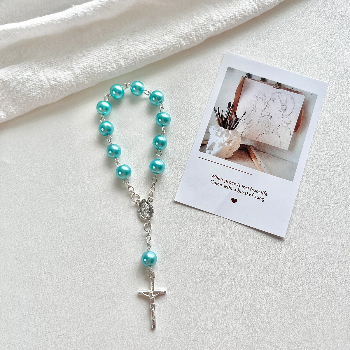 1Pcs Baby 6/8mm Glass Pearl Rosary Bracelet Eucharist Gift Cross Finger Chain Religion Mini Rosary Bracelet Pray