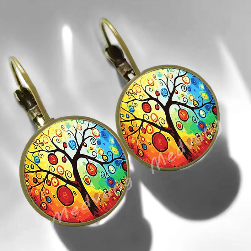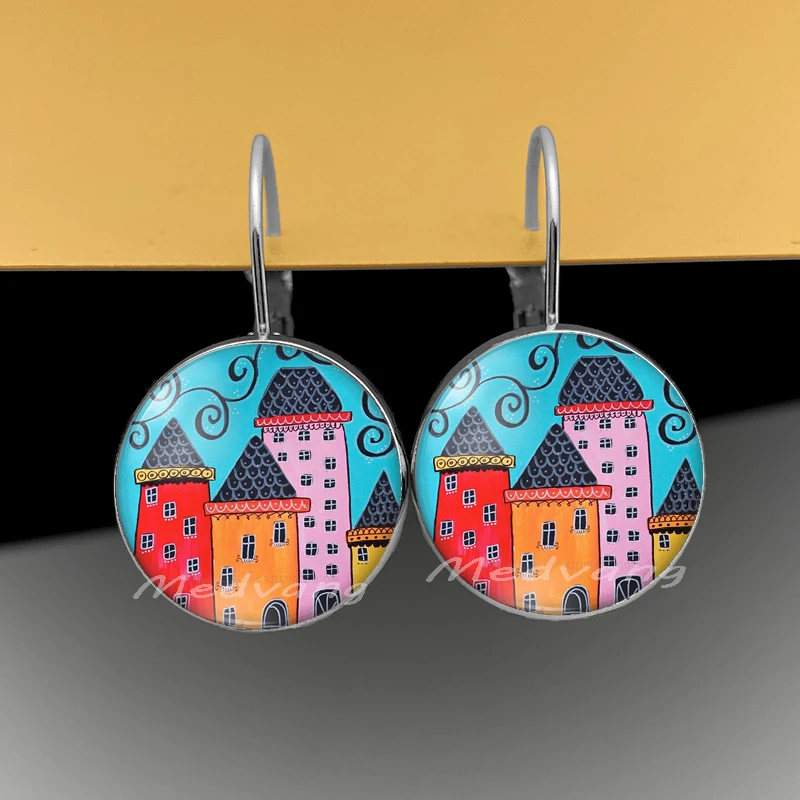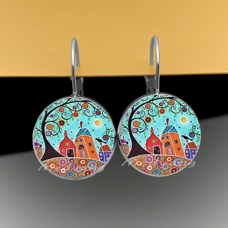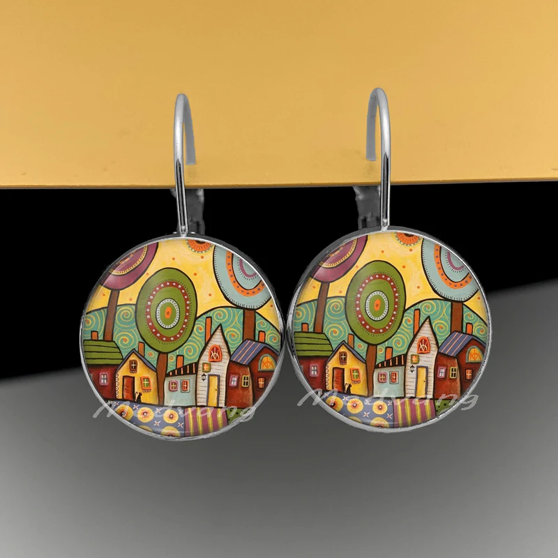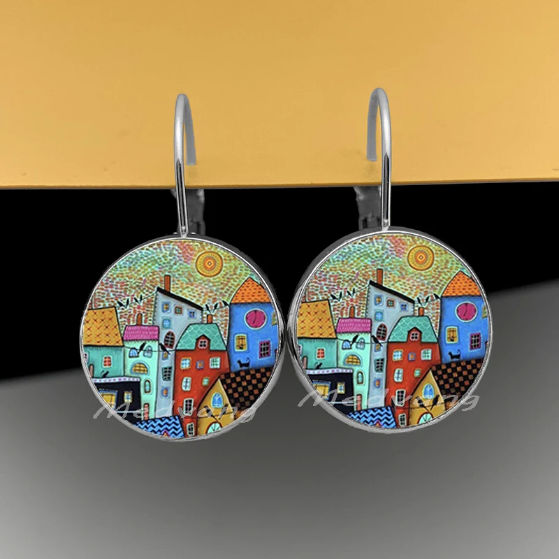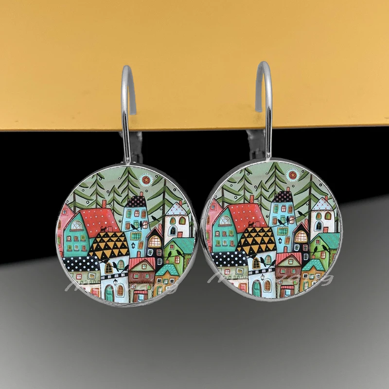 - 2024 Natural Scenery Earrings beautiful village Women Stud Earring Abstract Oil Painting House Glass Cabochon Earrings jewelry