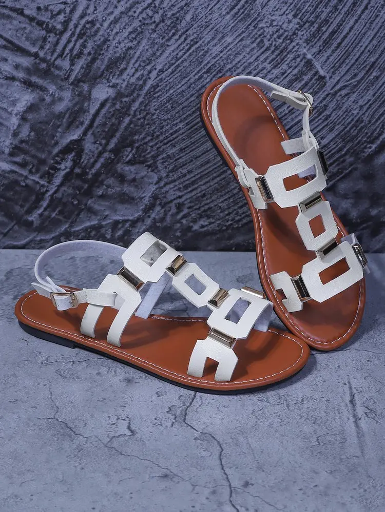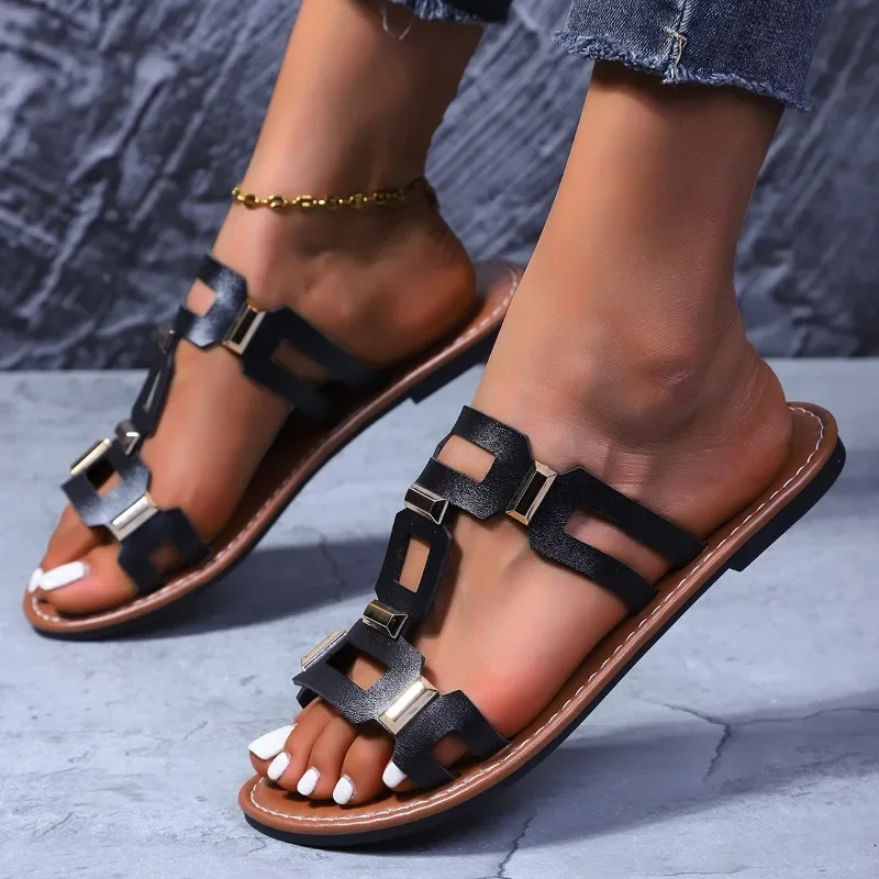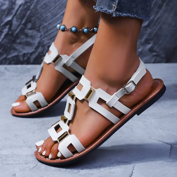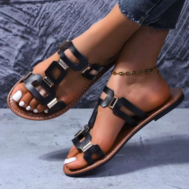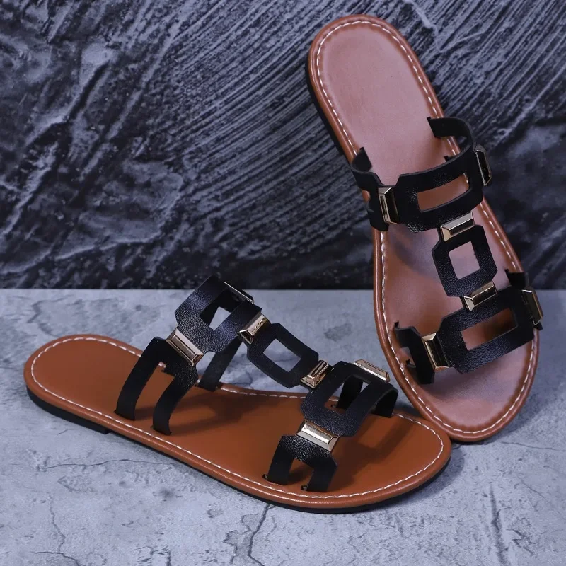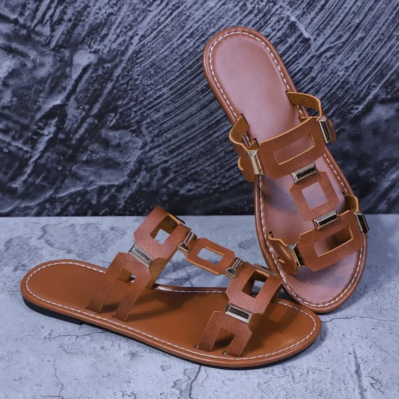 2025 Round Headed Leather Ladies' Sandals Flat Casual Beach Shoes Comfortable Footwear with Metal Decoration for Women