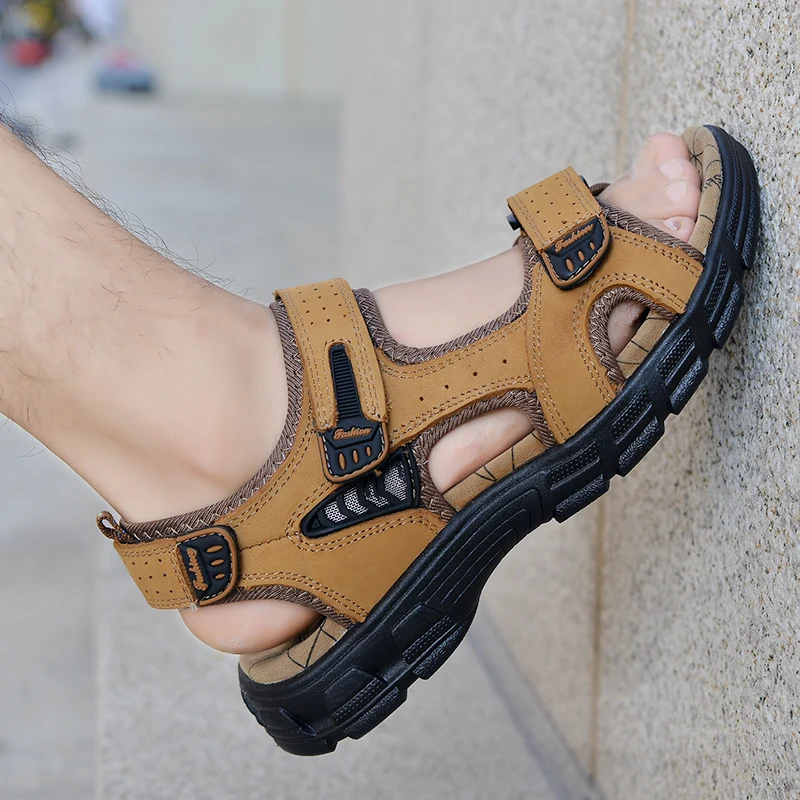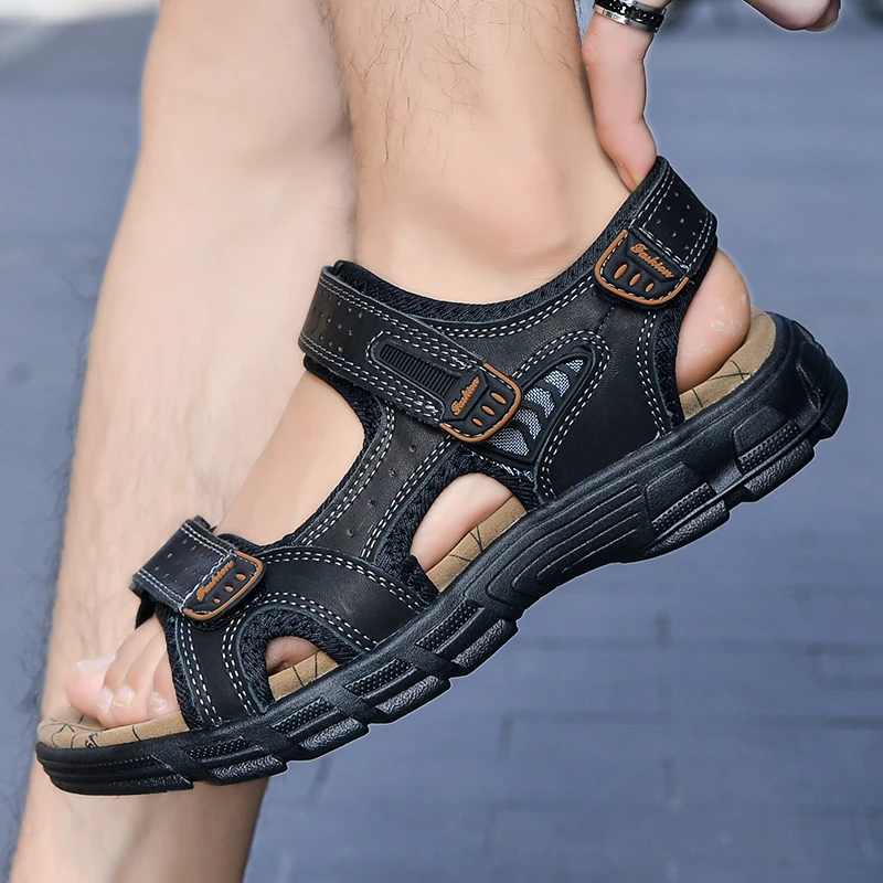 Classics Men's Sandals Summer Genuine Leather Sandals Handmade Outdoor Mesh Men Footwear Soft Breathable Metal Leather Slippers
