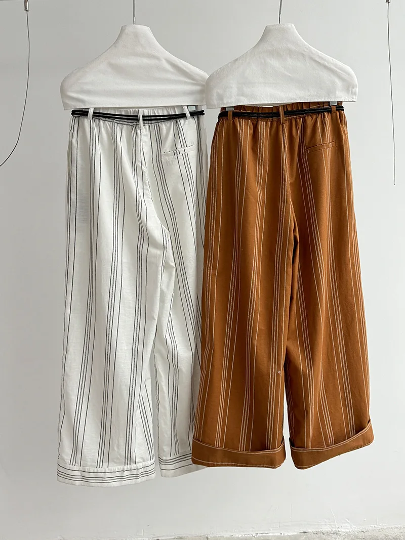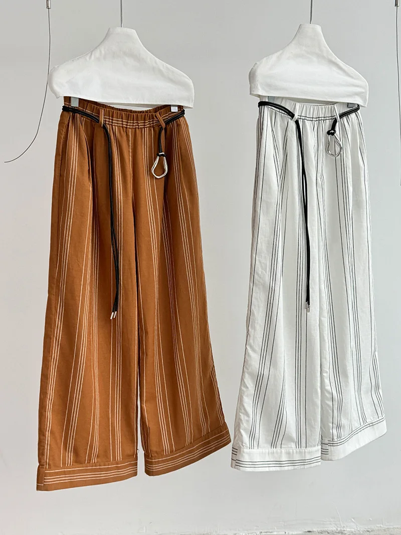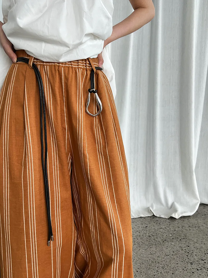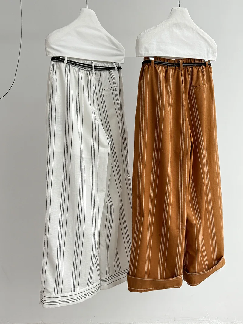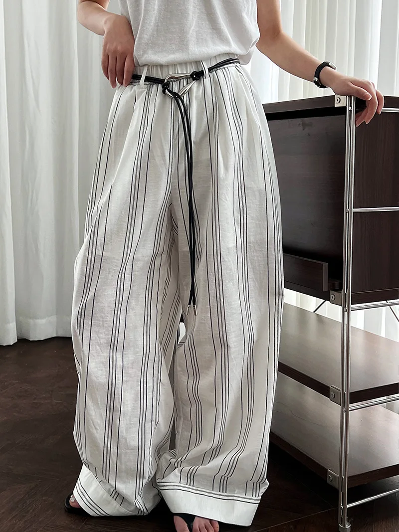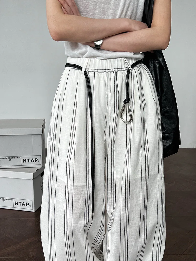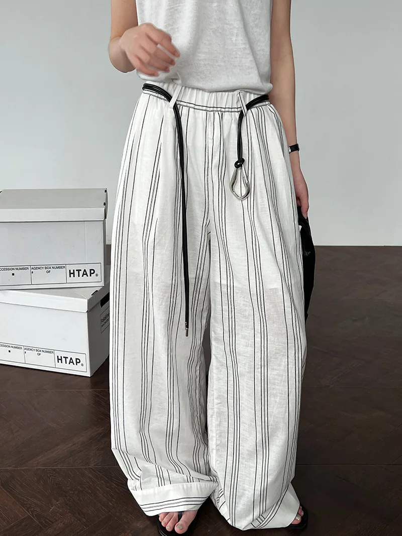 Cotton Linen Bohemian Long Pant Old Money Style Striped Elastic Casual Pants Women Summer Waist Belt Lazy Wide Legs Pants