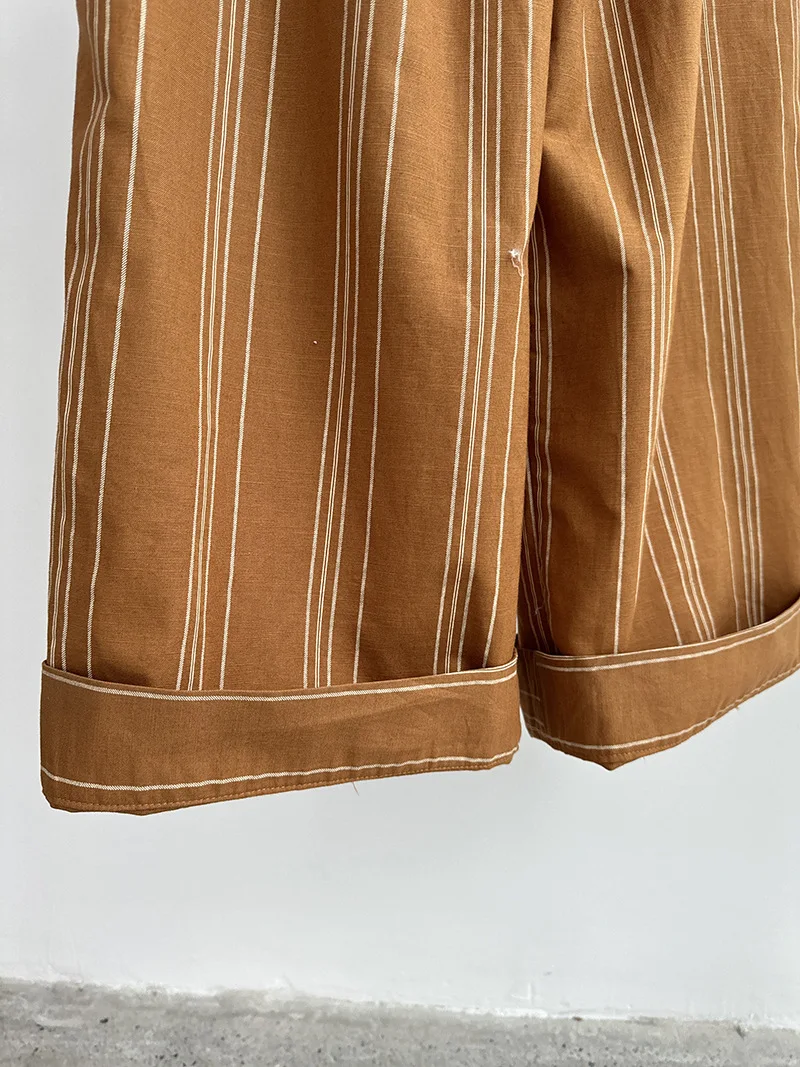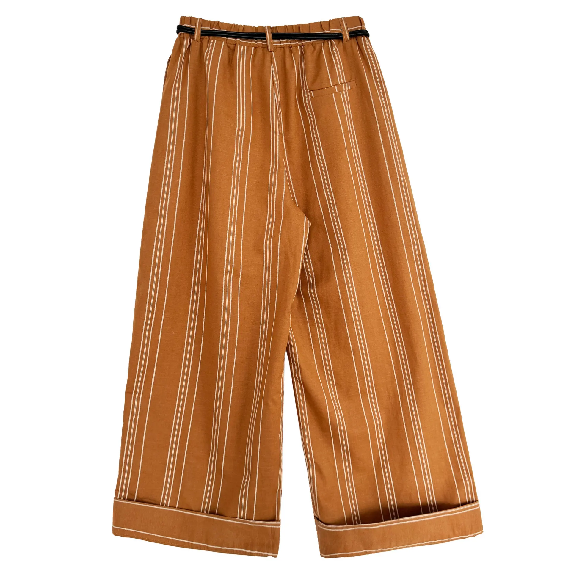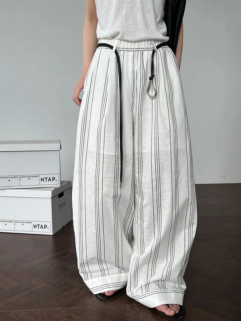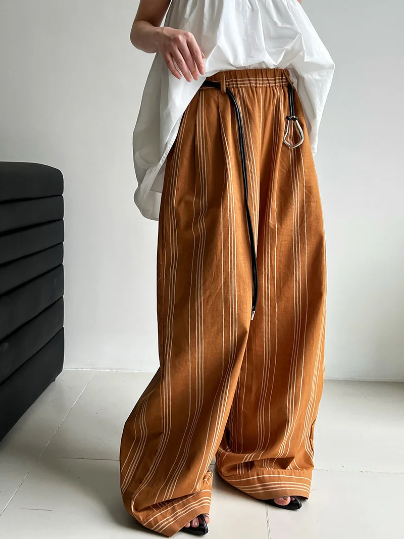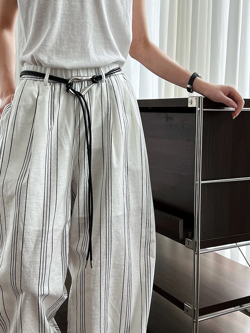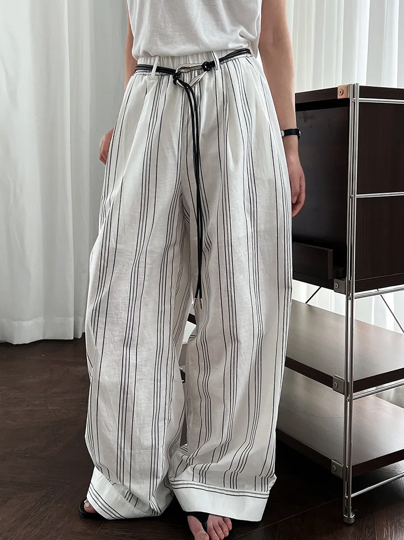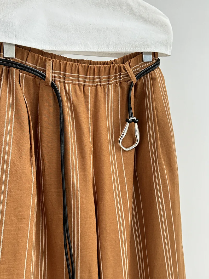 Cotton Linen Bohemian Long Pant Old Money Style Striped Elastic Casual Pants Women Summer Waist Belt Lazy Wide Legs Pants