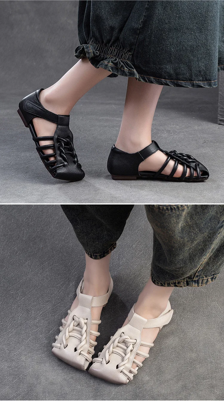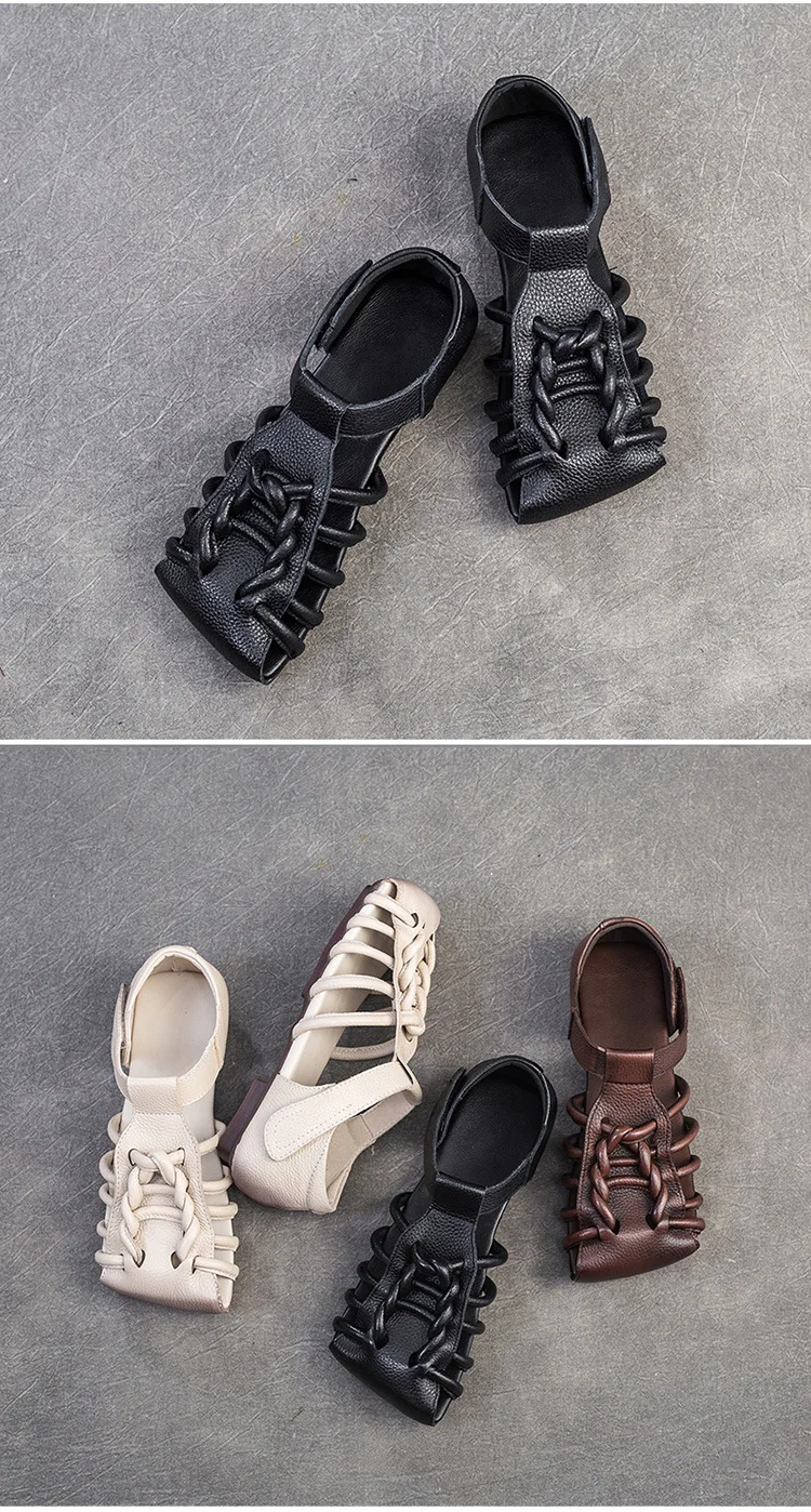 Genuine Leather Sandals Women Handmade Woven Literary Style Hollow Flat Roman Sandals Ladies Summer Shoes Sandalias