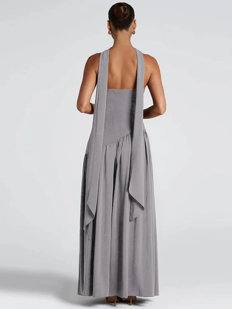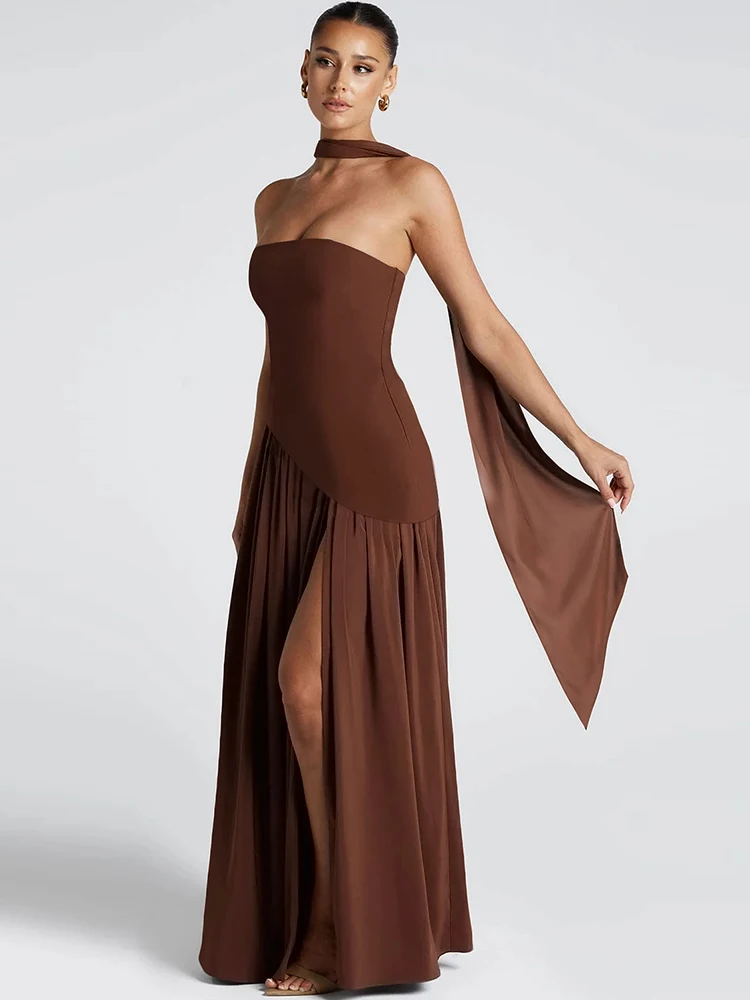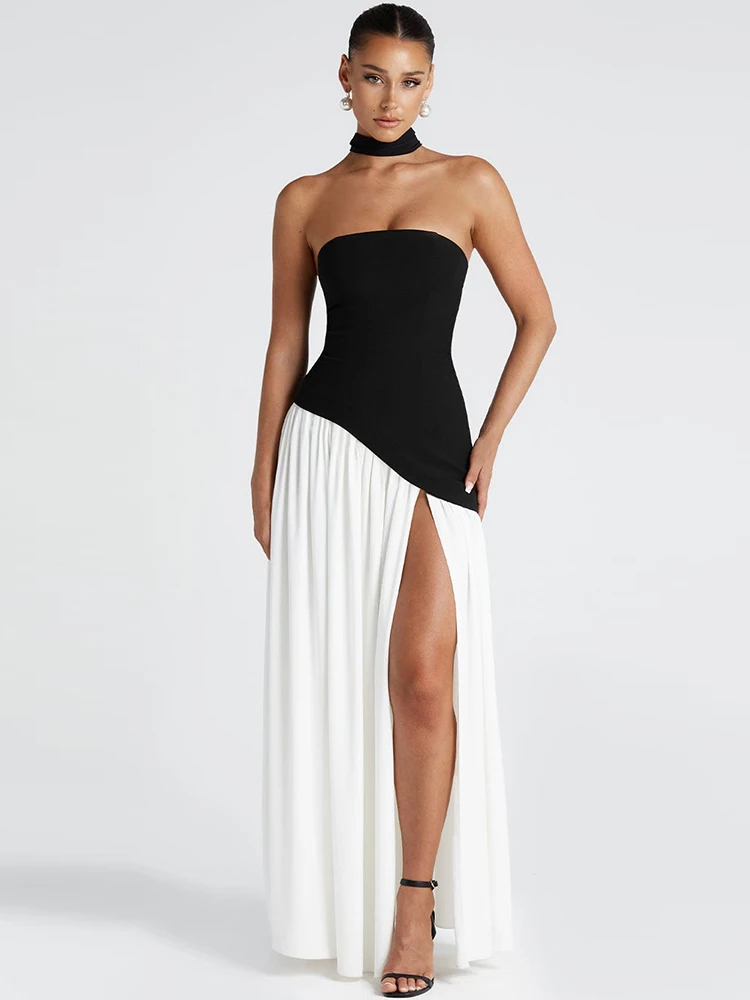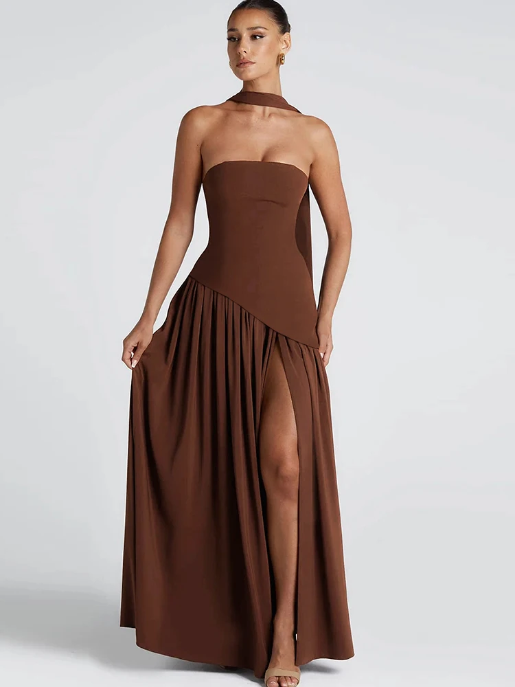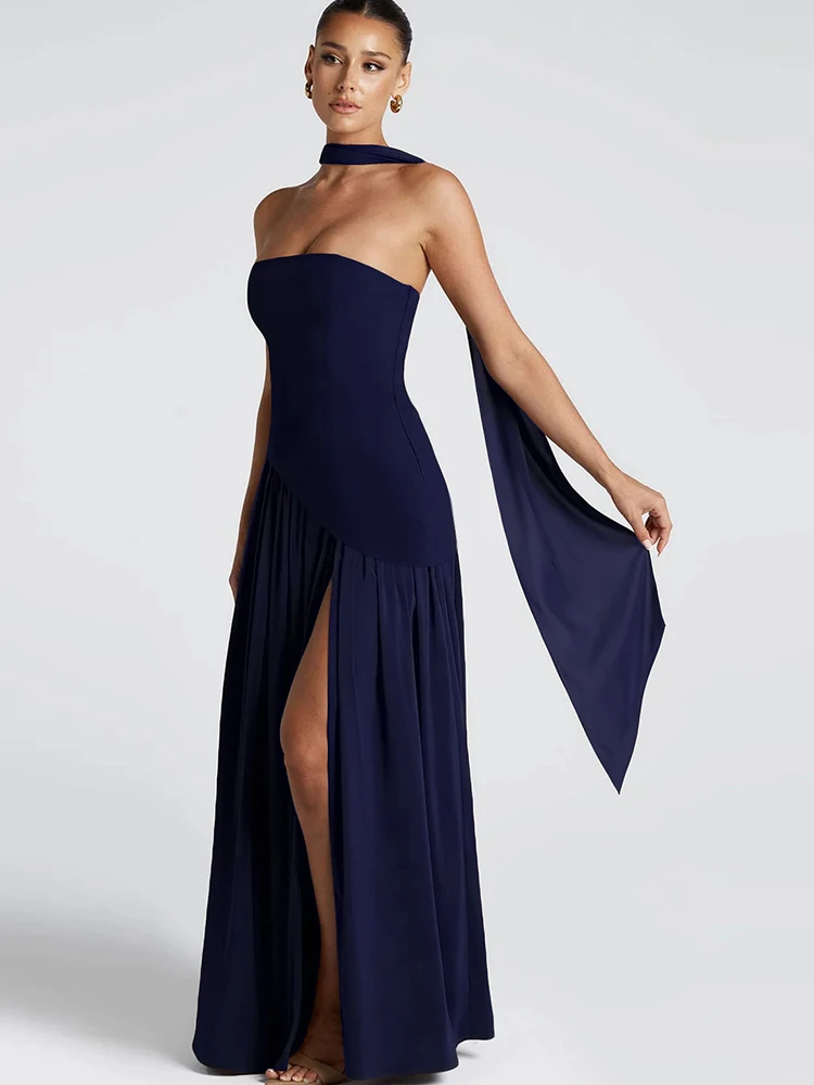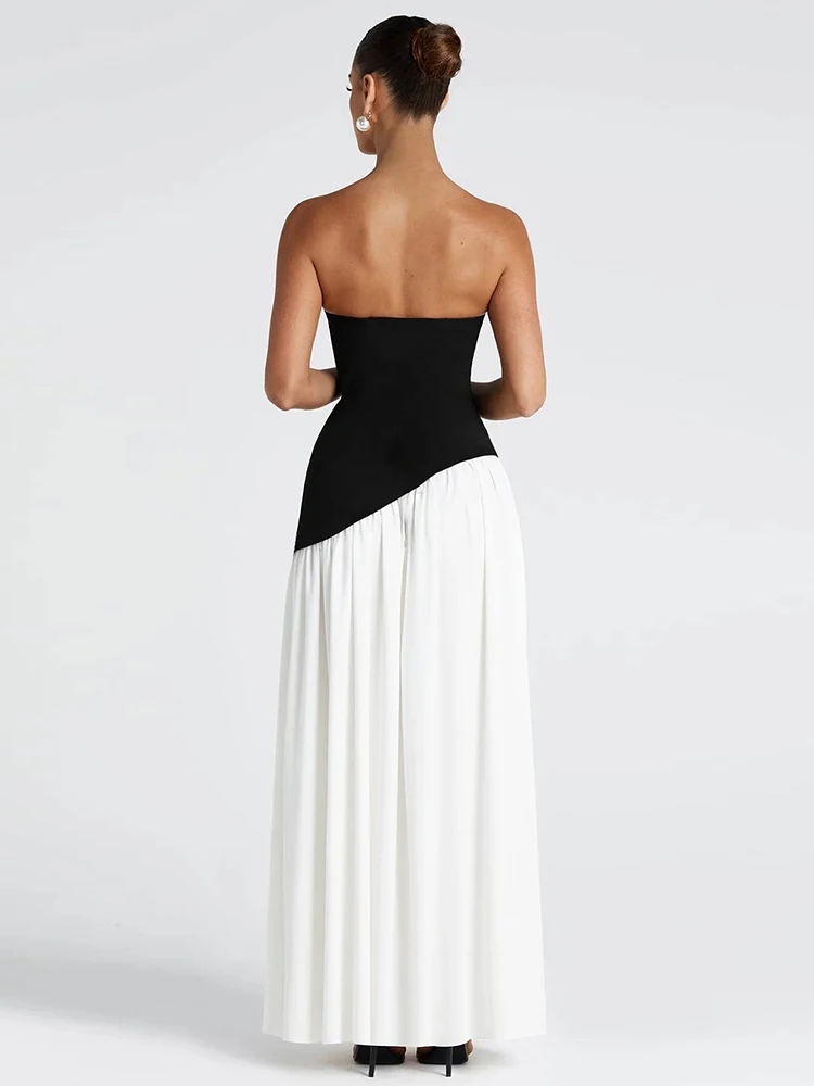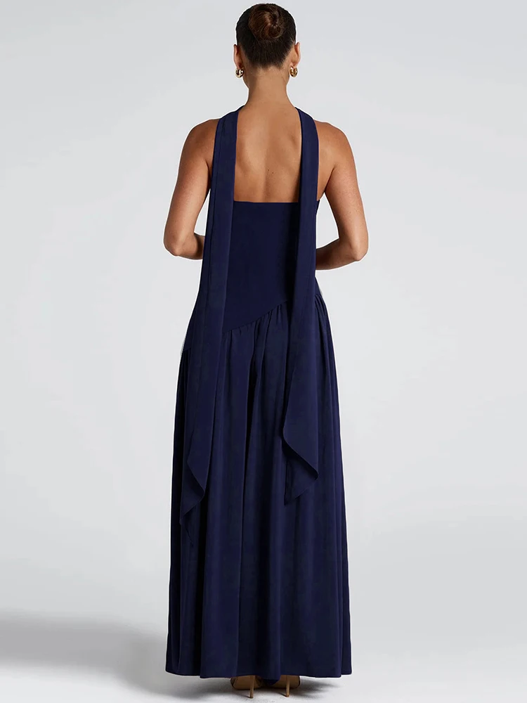 kliou Patchwork Draped Women Dress Classic Solid Wrapped Chest Draped Flare Long Robe Mujer Concise High Street Elegant Frock