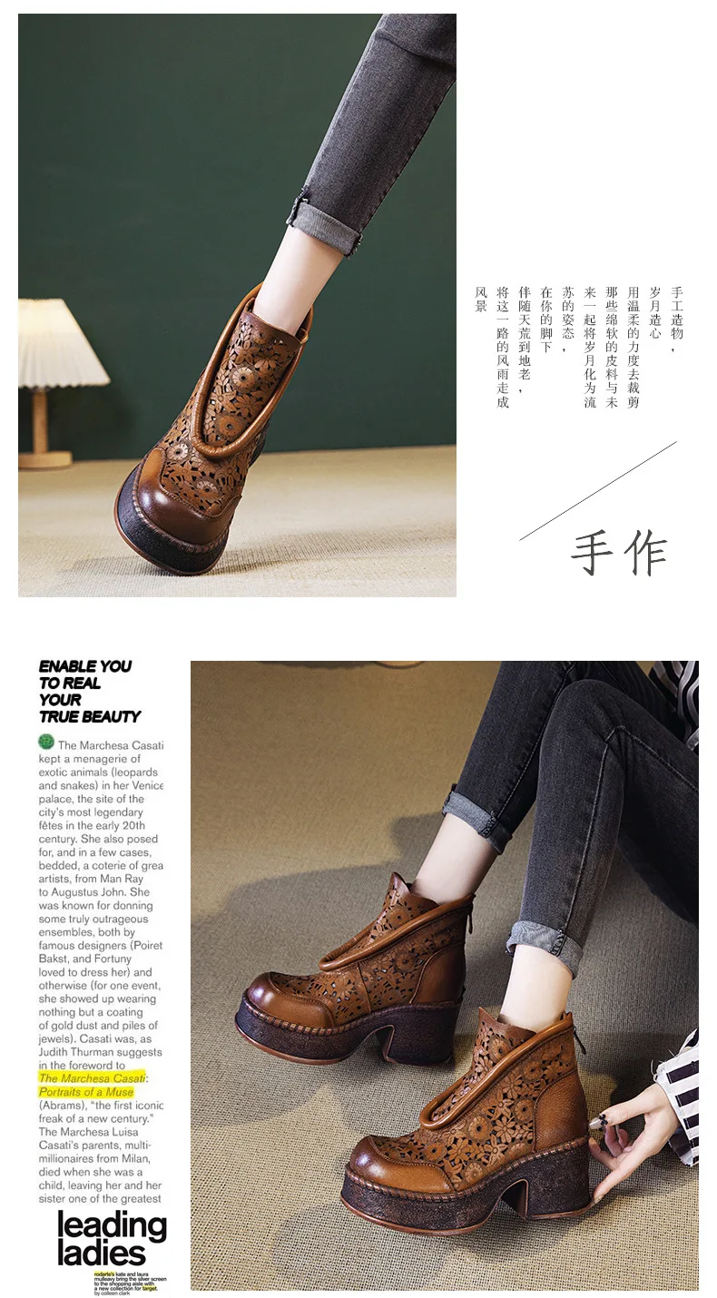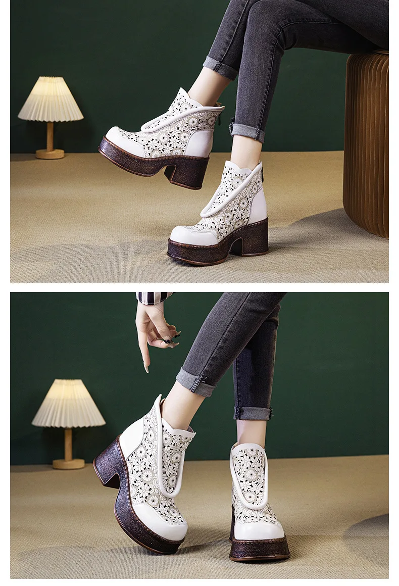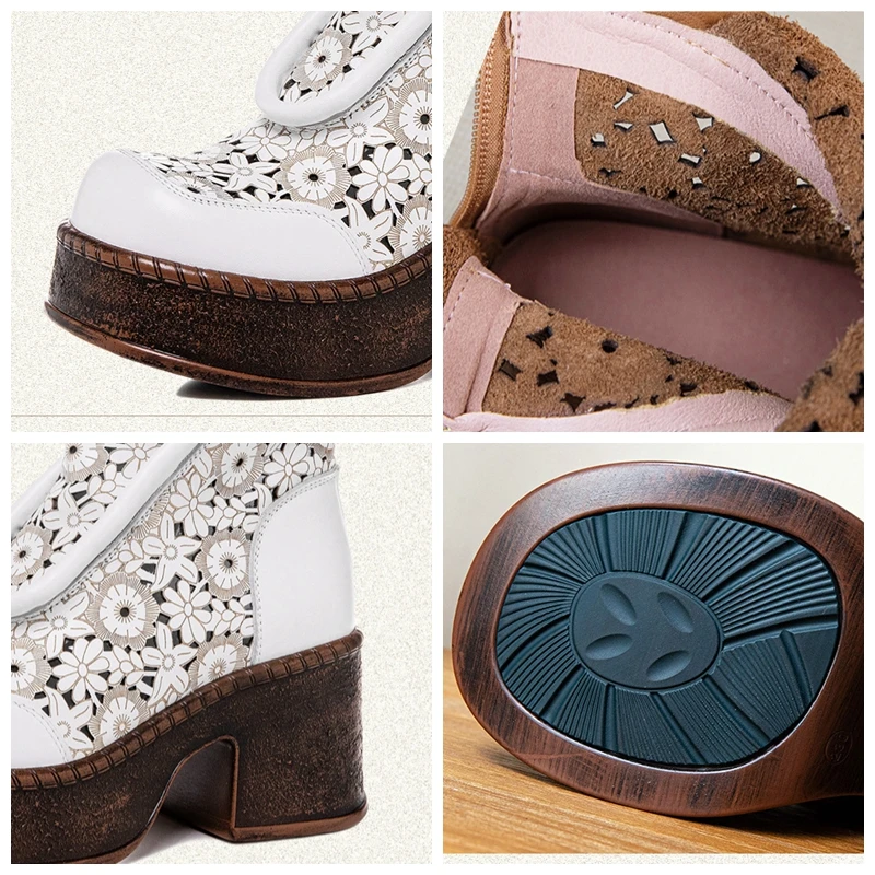 Koznoy 7.5cm Genuine Leather Sandals Ankle Booties Women Hollow Chimney Moccasins Fashion Summer Motorcycle Natural Boots Shoes