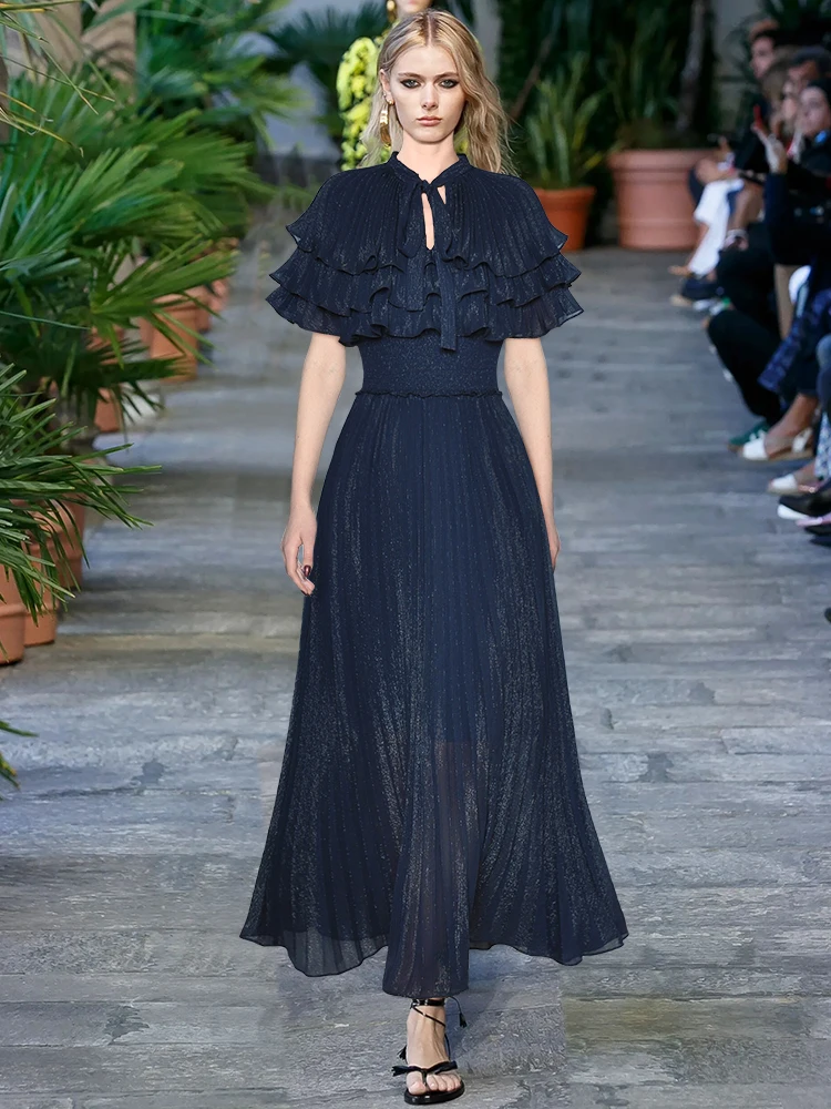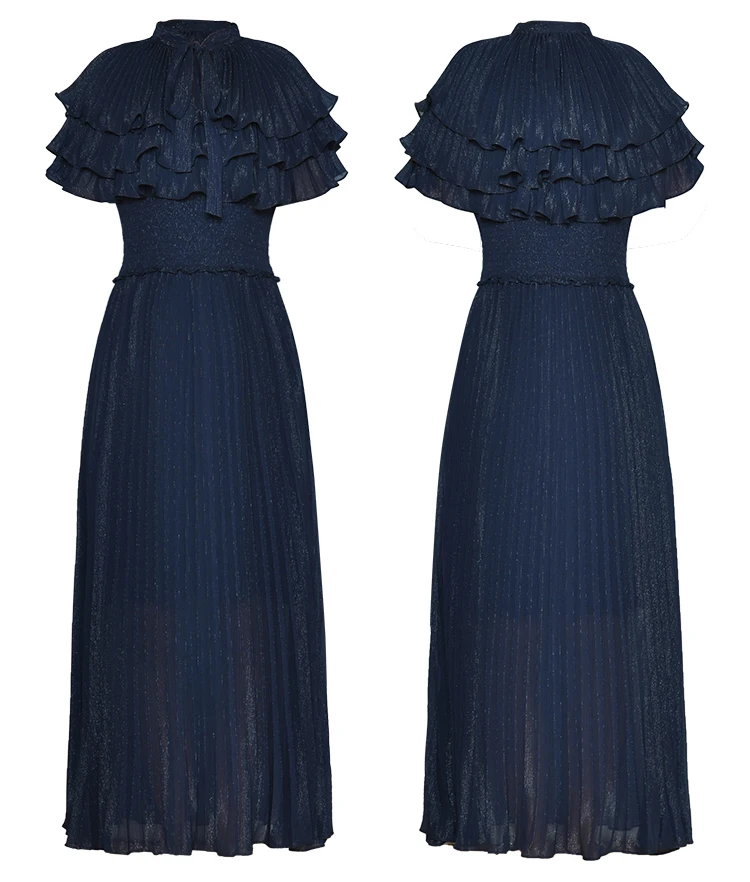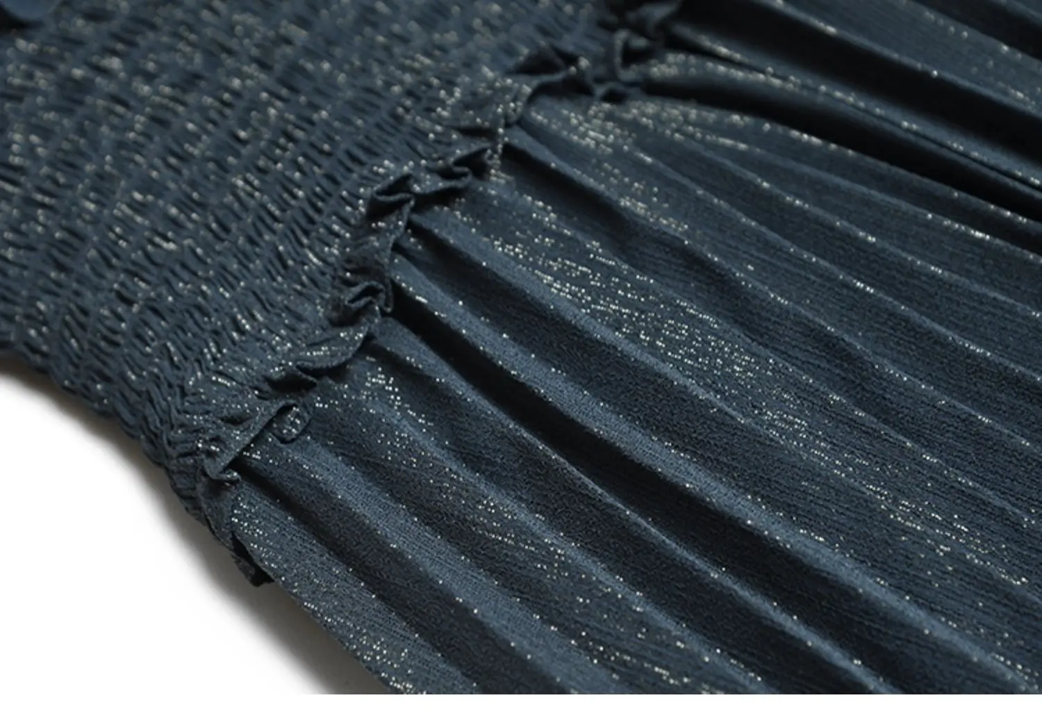 Lace Up Tie Collar Lady Dress 2025 Summer Cloak Stretch Waist Pleated Elegant Large Hem Shiny Women's Long Chiffon Dresses