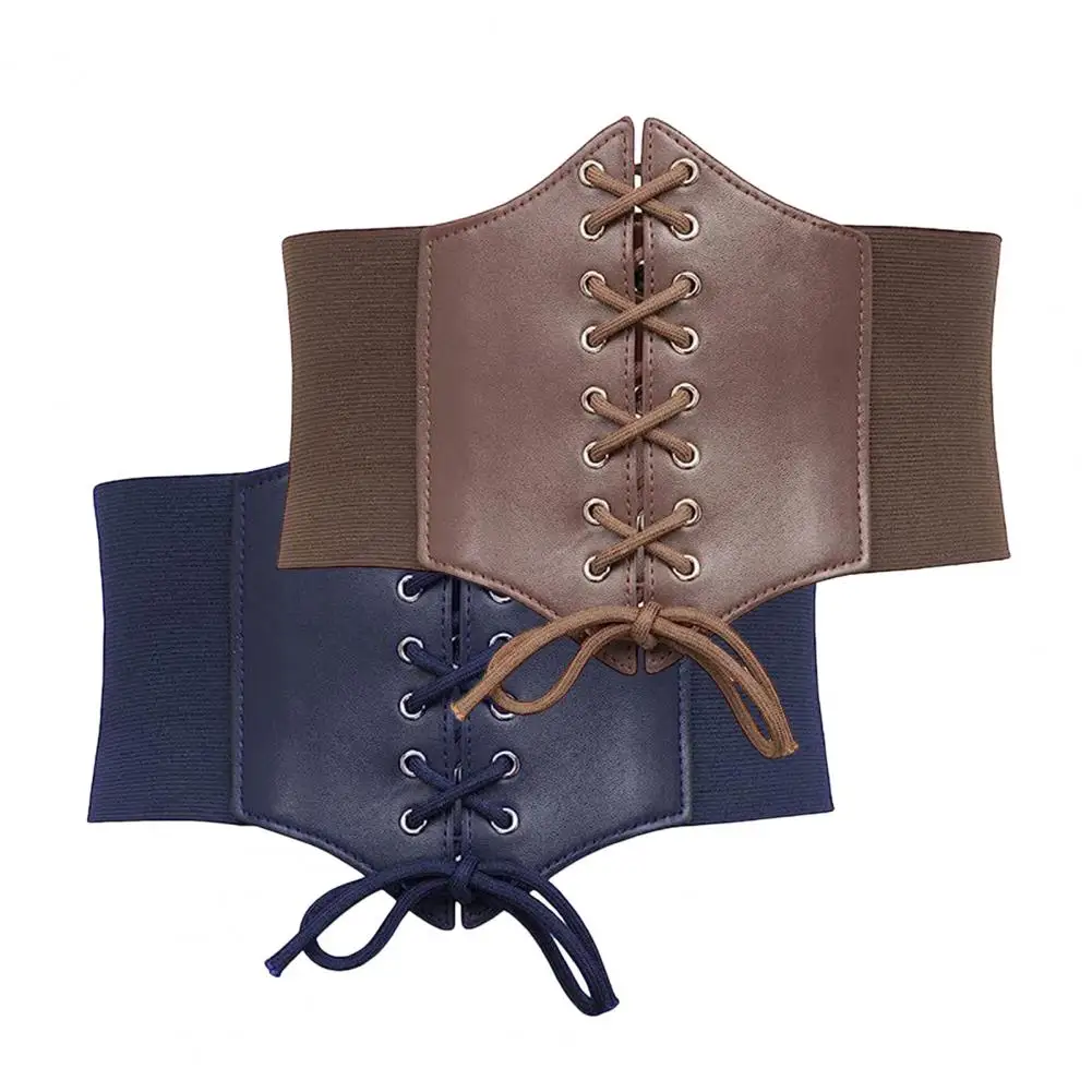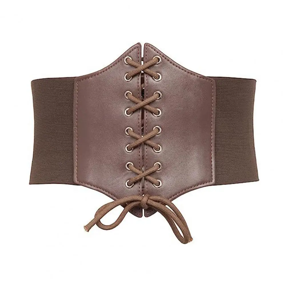 Women Corset Elastic Waistband Lace-up Wide Belt Solid Color Imitation Leather Outfits Dresses Tops Waist Cincher