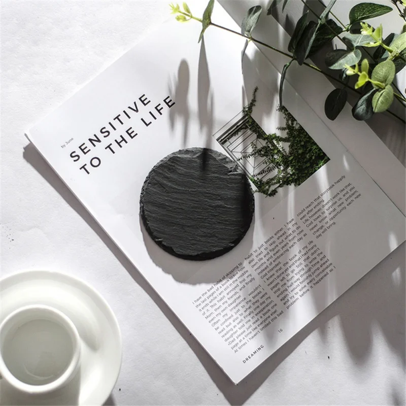 Round Natural Black Stone Slate Plate Serving Plate Cheese Pizza Dessert Cake Plate Western Steak Plates Cup Mug Rock Coaster