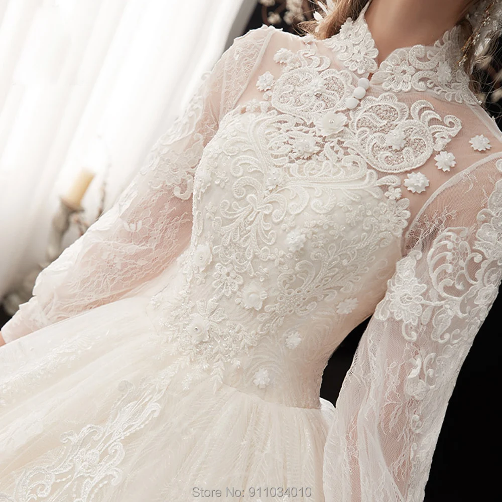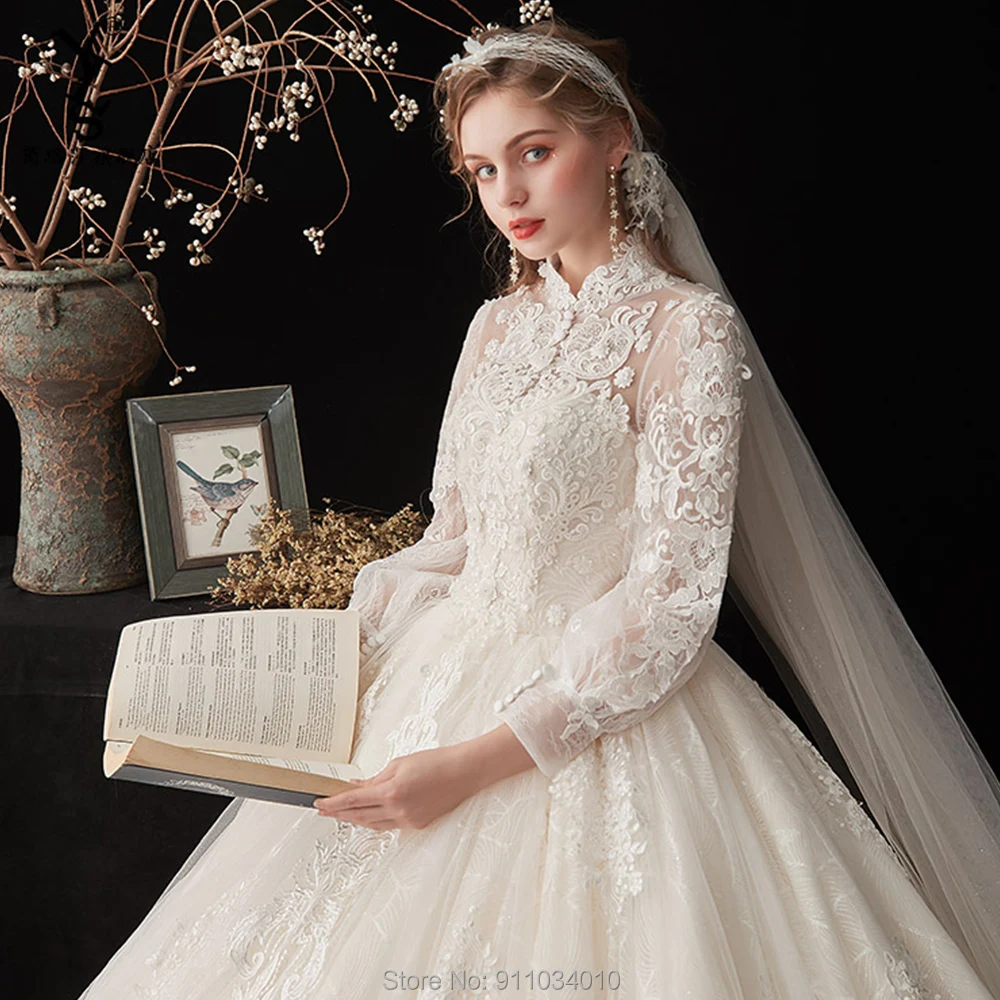 Stunning Shinny Wedding Dress Customized High Collar Covered Button Long Sleeves Ball Bridal Gowns Real Work Vestido Noiva