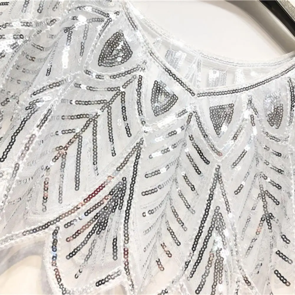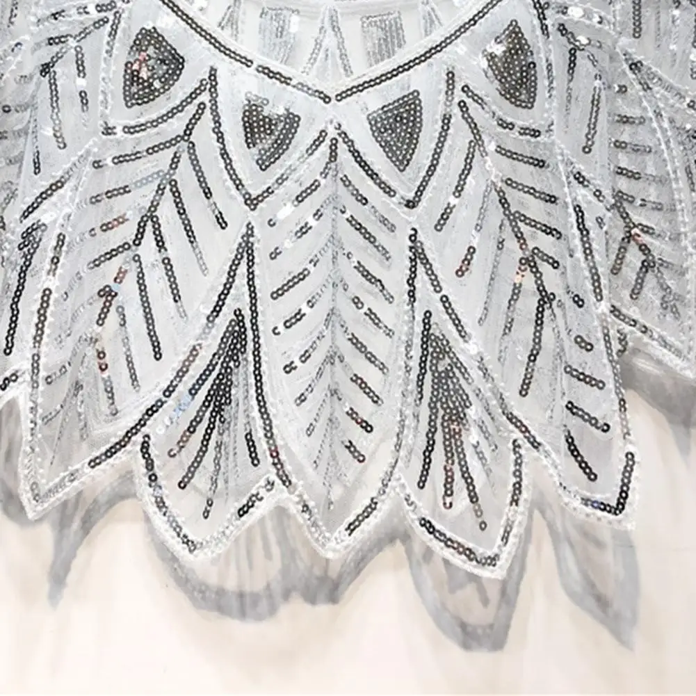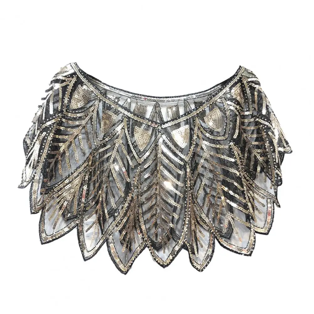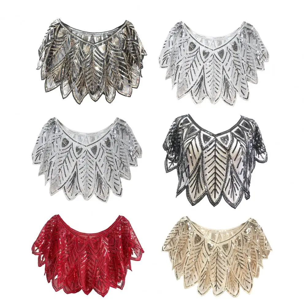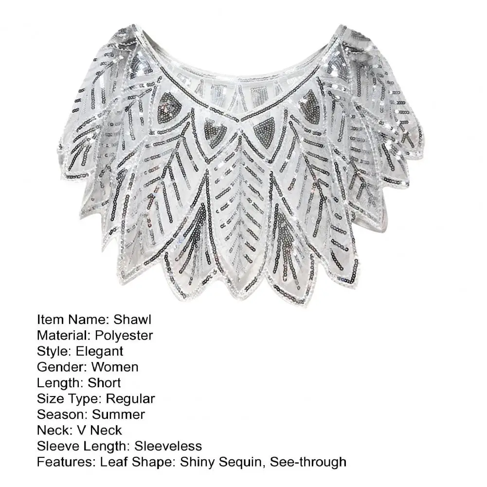 Women 1920s Evening Shawl Elegant Embroidered Beaded Capelet for Women Sparkling Sequin Party Shawl with Leaf Shape Gauze V Neck