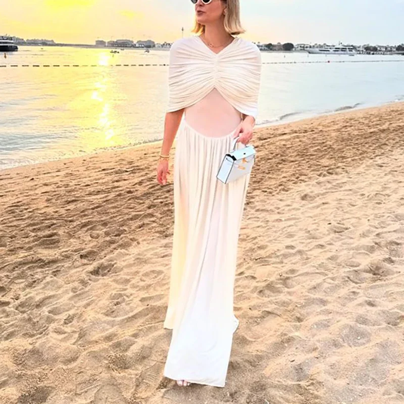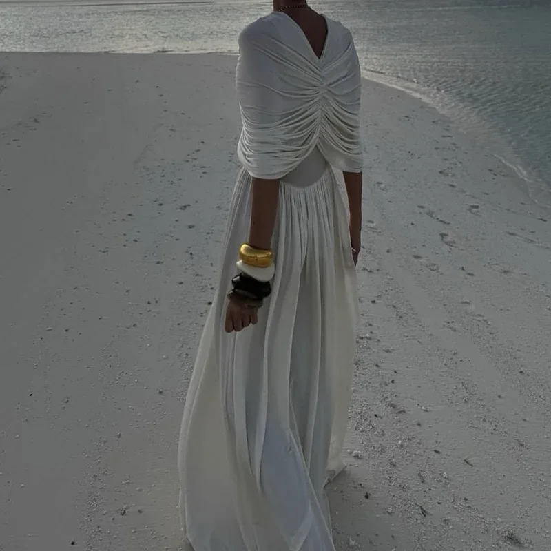 Women Shawl Patchwork Folds High Street Dresses Summer Ladies Elegant Temperament White Lady Chic Evening Gown For Women 2025